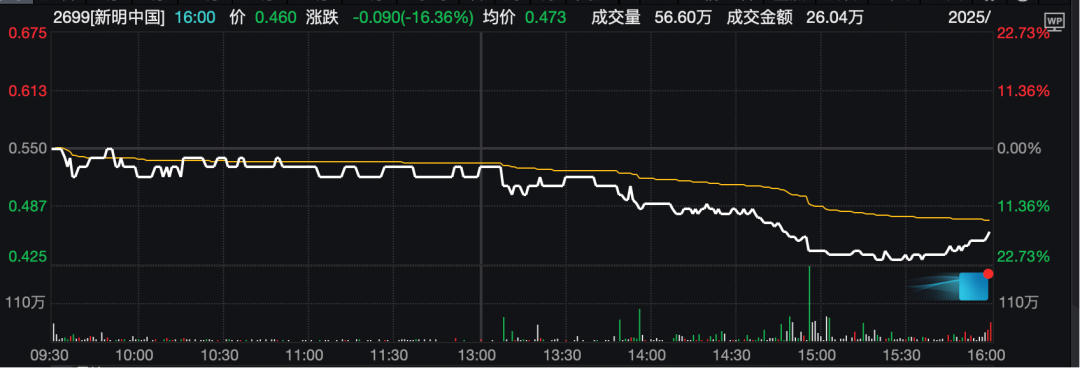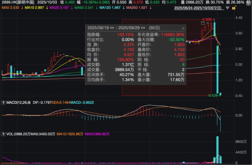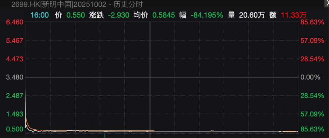 10月3日,港股新明中国盘中一度大跌超22%,收盘跌幅有所收窄,但仍跌16.36%。
