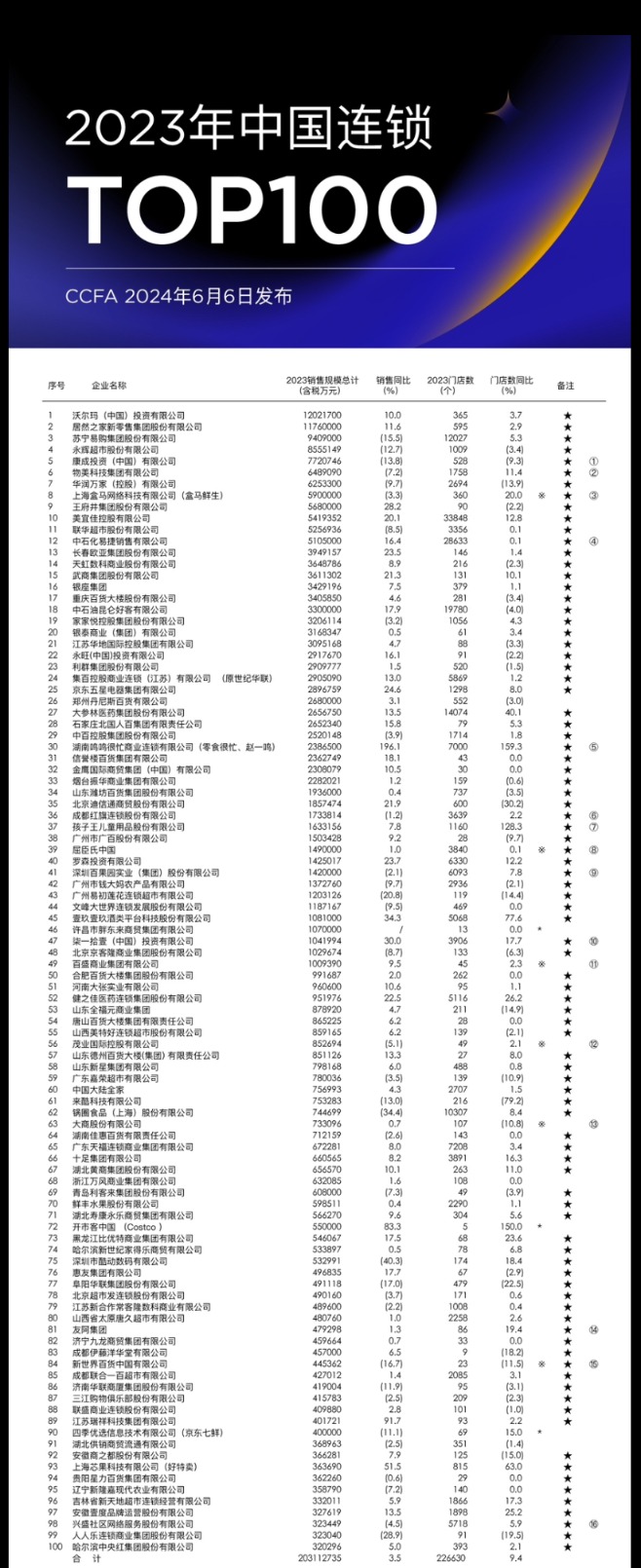 根据2023年行业基本情况调查结果,6月6日,中国连锁经营协会(CCFA)发布“2023年中国连锁TOP100”。