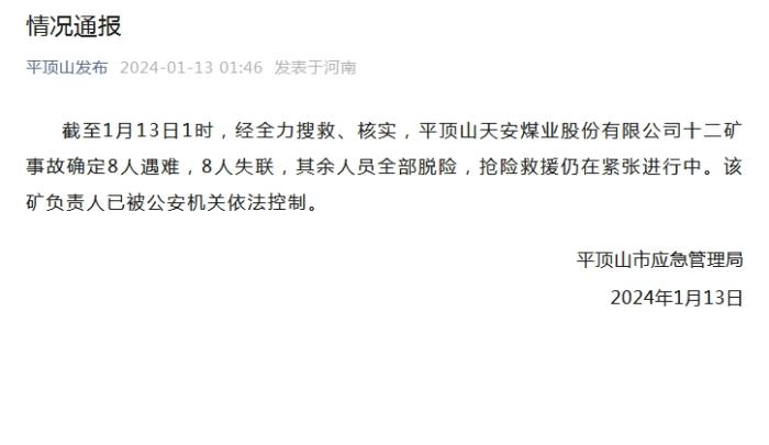 中新网1月13日电据河南平顶山市政府官方微信公众号消息,平顶山市应急管理局13日发布情况通报称,截至1月13日1时,经全力搜救、核实,实盘配资网站平顶山天安煤业股份有限公司十二矿事故确定8人遇难,8人失联,其余人员全部脱险,抢险救援仍在紧张进行中。该矿负责人已被公安机关依法控制。